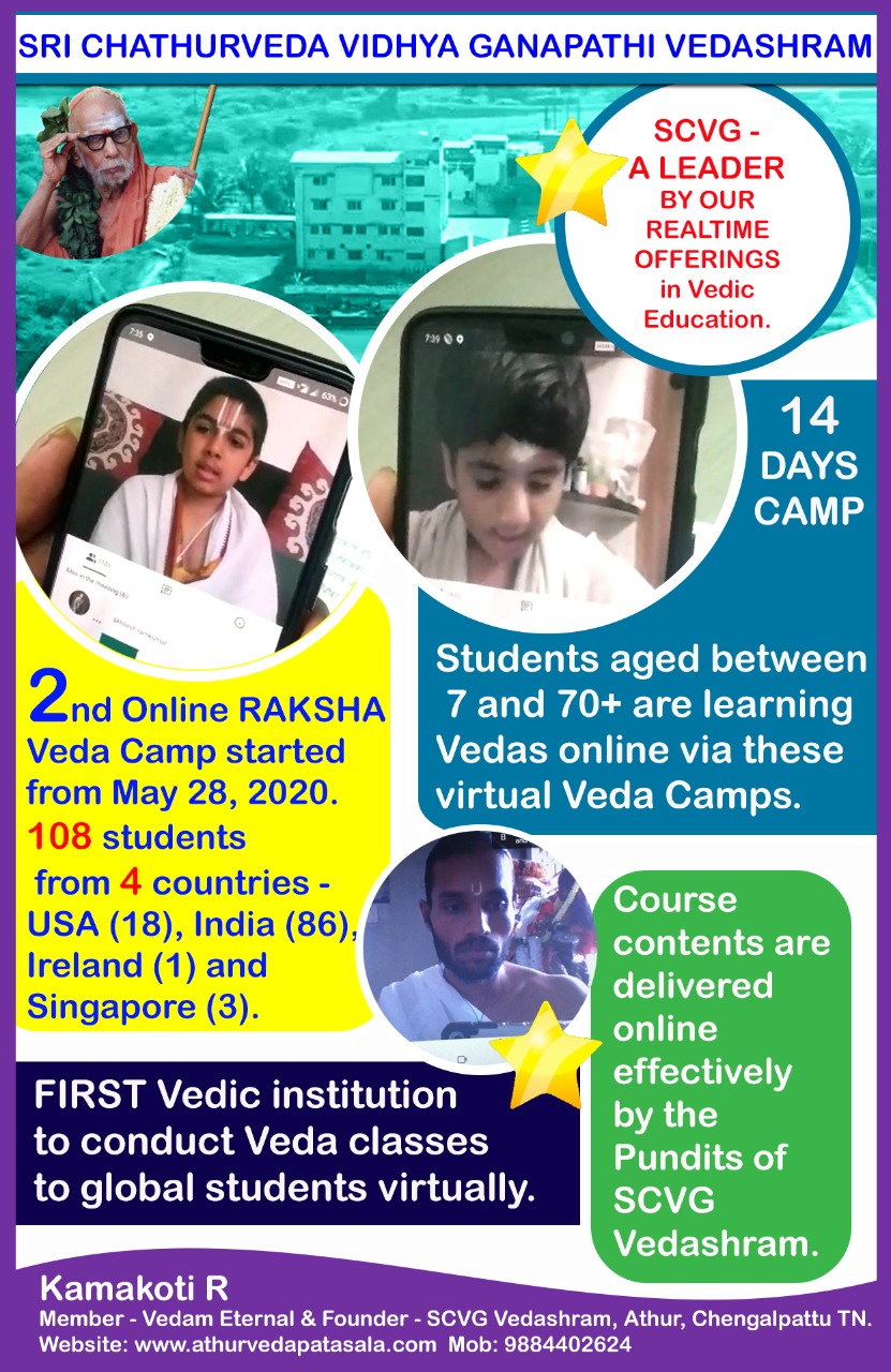 Suprabhatham. "SCVG's realtime offerings in Vedic Education". Camp 2 is now built on to the foundation of RAKSHA Veda Camp I and offered for 108 students from across the globe, covering different time zones. In divine service...... Kamakoti R, Member - "Vedam Eternal " and Founder - Sri Chathurveda Vidhya Ganapathi Vedashram, Athur near Chengalpattu TN. Website: www.athurvedapatasala.com Mob: 9884402624